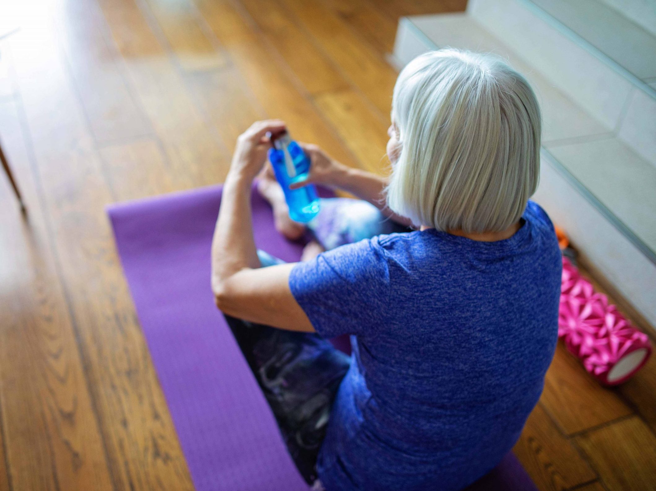 Equipment: hand weights (dumbbells or soup cans), resistance band (ideally one light and one medium), sturdy chair without armrests, water to drink
